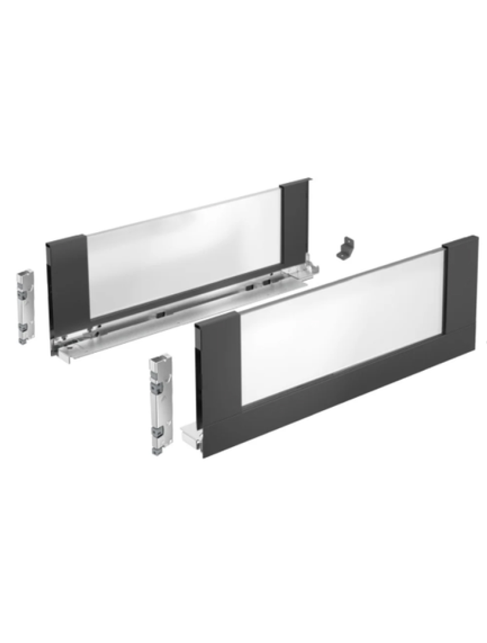 Replaces the traditional drawer sides with a glass finish that lights on its own when opened. Custom-cut bottom panel, back panel, and front of the drawer and you will be able to assemble a drawer for your kitchen or wardrobe. Elegance is provided by the straight black lines of the hardware and tempered dark glass.